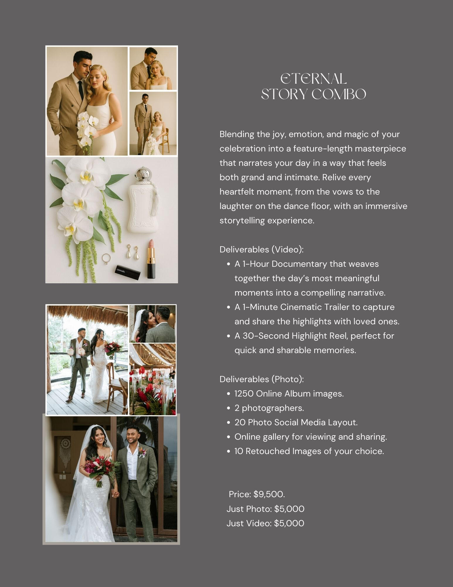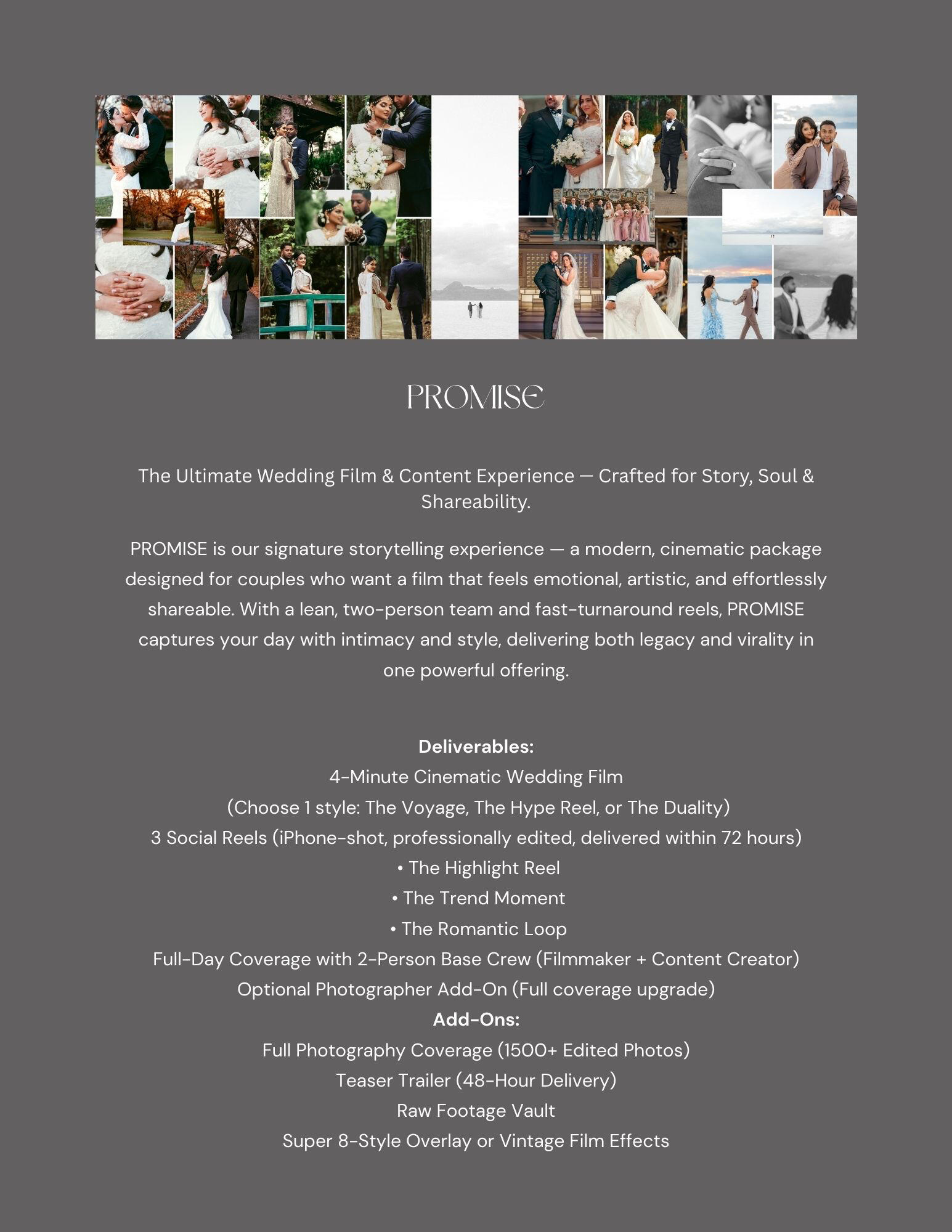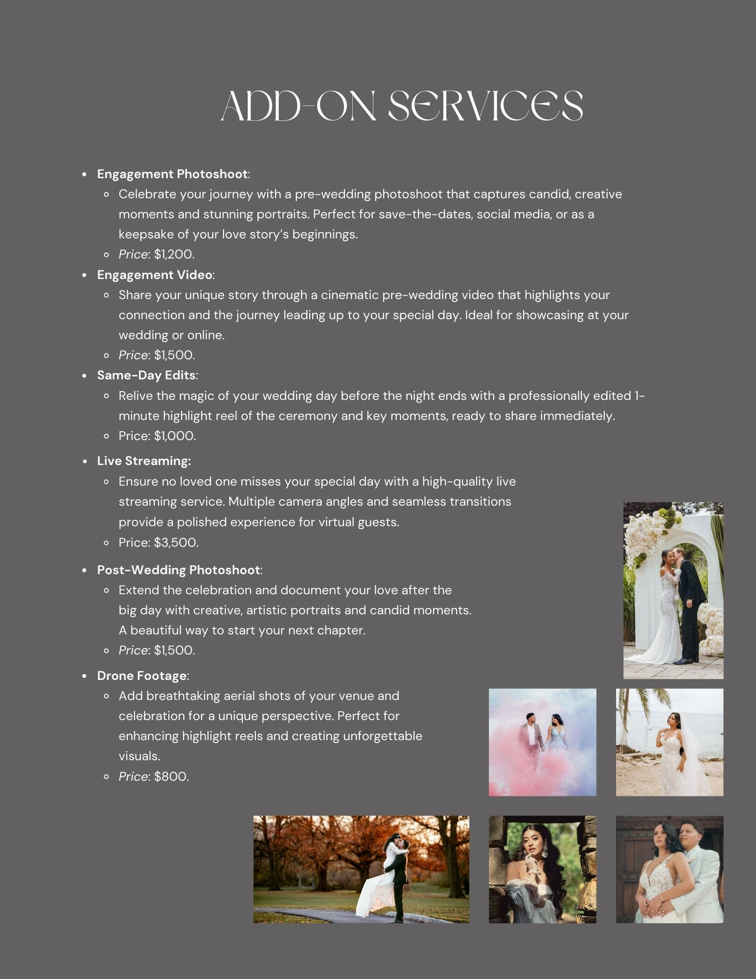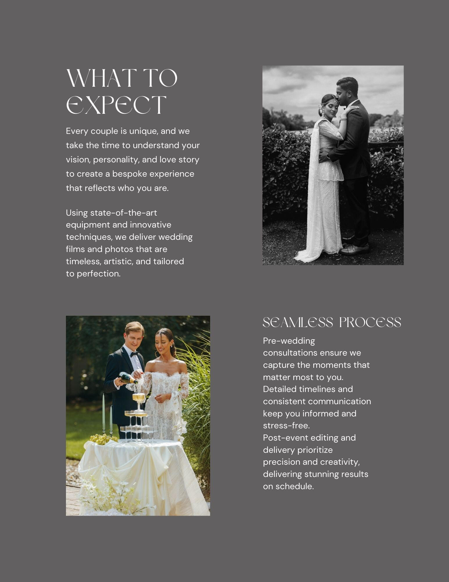 Our team captures your day with intention — from timeless portraits to behind-the-scenes moments and full wedding livestreams. Every frame is crafted to feel personal, editorial, and unforgettable.Your story, told beautifully.